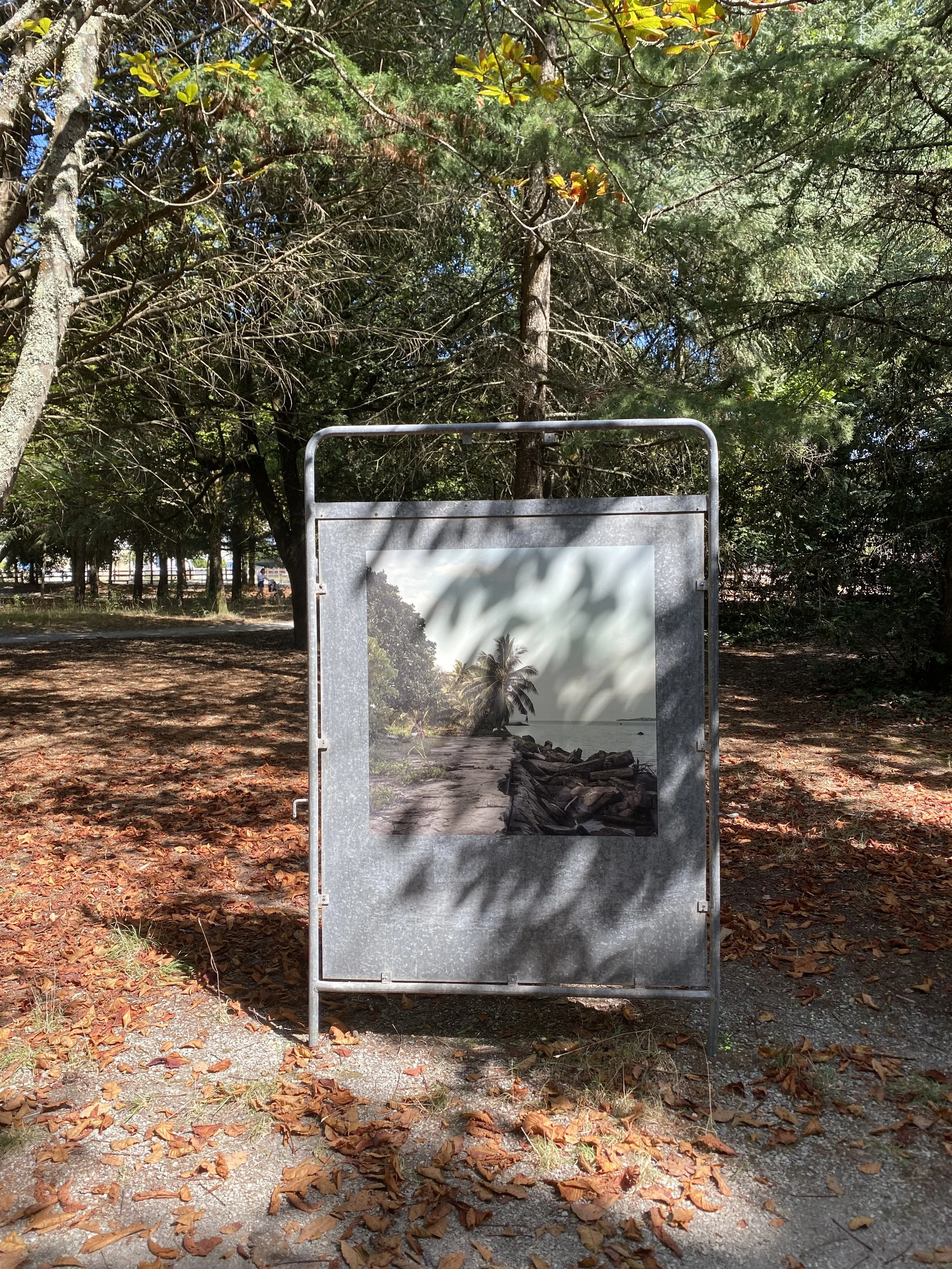En utilisant les panneaux électoraux, mobilier déjà disponible en mairie, nous évitons d’investir dans de nouveaux supports onéreux et difficilement stockables. Expérimentons, ici dans le bois du Pouliguen, une façon originale, économique et écologique de diffuser la photographie tout en gardant une grande exigence dans le rendu et surtout en plaçant le travail des artistes en premier.